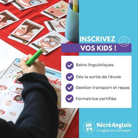 Dès la sortie de l'école, pour la pause déjeuner ou pour le goûter, votre formatrice RécréAnglais récupère vos enfants par petits groupes et se charge de tout, en anglais : gestion du transport, des repas et de toutes les activités !