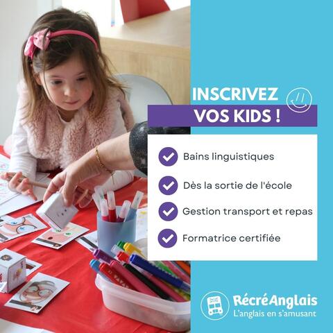 Dès la sortie de l'école, pour la pause déjeuner ou pour le goûter, votre formatrice RécréAnglais récupère vos enfants par petits groupes et se charge de tout, en anglais : gestion du transport, des repas et de toutes les activités !